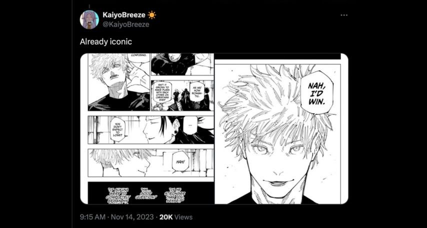 Satoru Gojo’s iconic line, “Nah, I’d win,” from Jujutsu Kaisen didn’t just remain inked on a manga page; it ignited a viral storm across the internet.